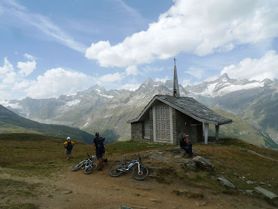 中間停下來面對洪峰吃野餐,麵包、火腿加起司,重裝背汽水的銳騰作出貢獻,舉杯敬山。繼續穿插步道與車道下山,直到巧克力車胎終於重蹈策馬特柏油路,我們花了約4小時下山。對照地圖,我們鮮少留在官方的登山車路徑中,到底怎麼下的?天知道!反正是不可能重複的破冰之旅。